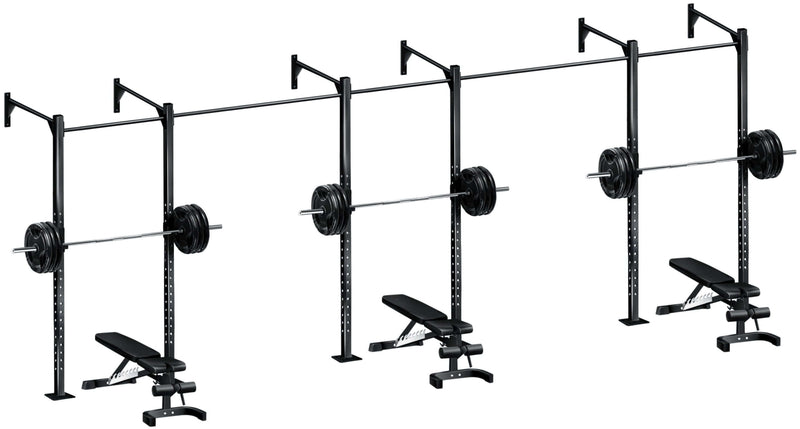 The French Fitness Wall Mount Rig & Rack System 1 is affixed to the wall and floor, giving any commercial or home gym area flexibility. Fully modular in design, you can add as many workout stations as you desire as your business expands. This rig may be built to any size and with whichever accessories you require. Multiple sections can be connected to create extended training stations that can accommodate numerous athletes at once.