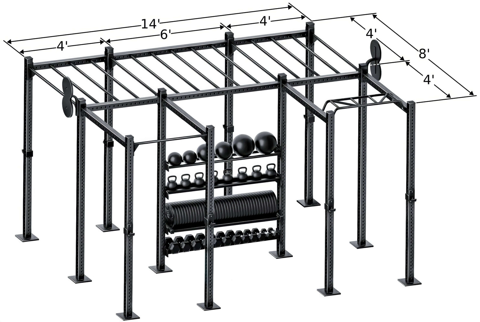 Note: Weight plates, spotter arms, dumbbells, kettlebells and medicine balls are not included. Primary Pic shows 3 sections. Please order 3 sections from the dropdown option to achieve this look.