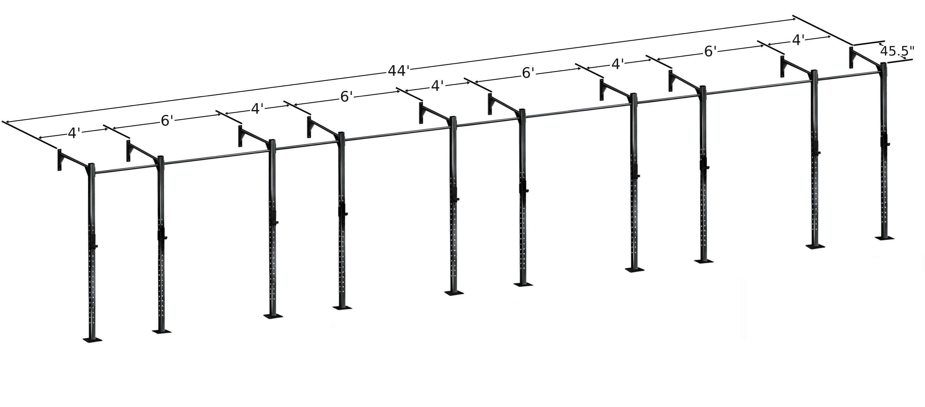 The French Fitness Wall Mount Rig & Rack System 1 is affixed to the wall and floor, giving any commercial or home gym area flexibility. Fully modular in design, you can add as many workout stations as you desire as your business expands. This rig may be built to any size and with whichever accessories you require. Multiple sections can be connected to create extended training stations that can accommodate numerous athletes at once.