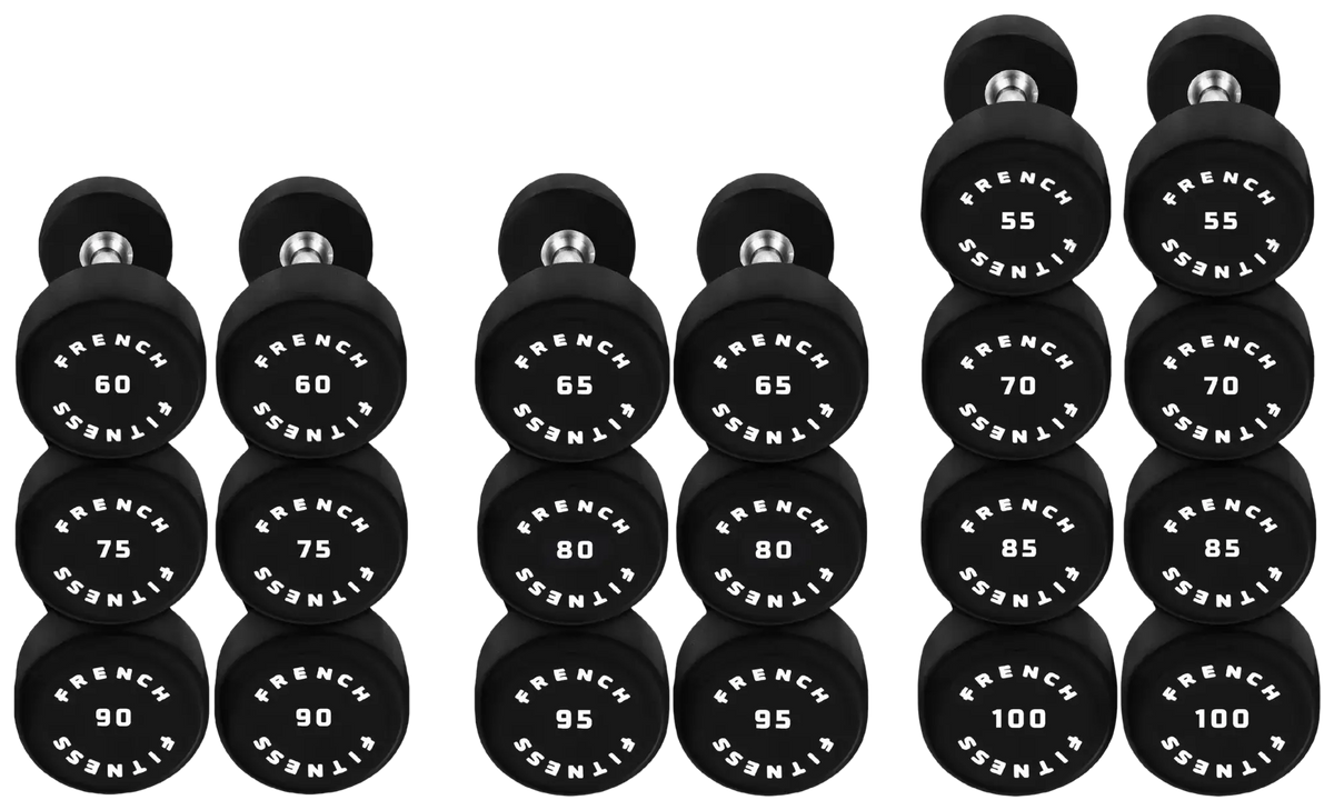 French Fitness Urethane Round Pro Style Dumbbell Set, 55-100 lbs (New)